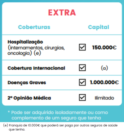 • Em reembolso: quando contratada, cobertura em regime de reembolso das despesas de hospitalização e ambulatório (opção Top) ou apenas hospitalização (Proteção Extra) realizadas livremente numa unidade de prestação de cuidados de Saúde, desde que devidamente comprovadas por recibo e acompanhadas de uma declaração em língua inglesa, francesa ou espanhola, para deslocações ao estrangeiro até 180 dias.